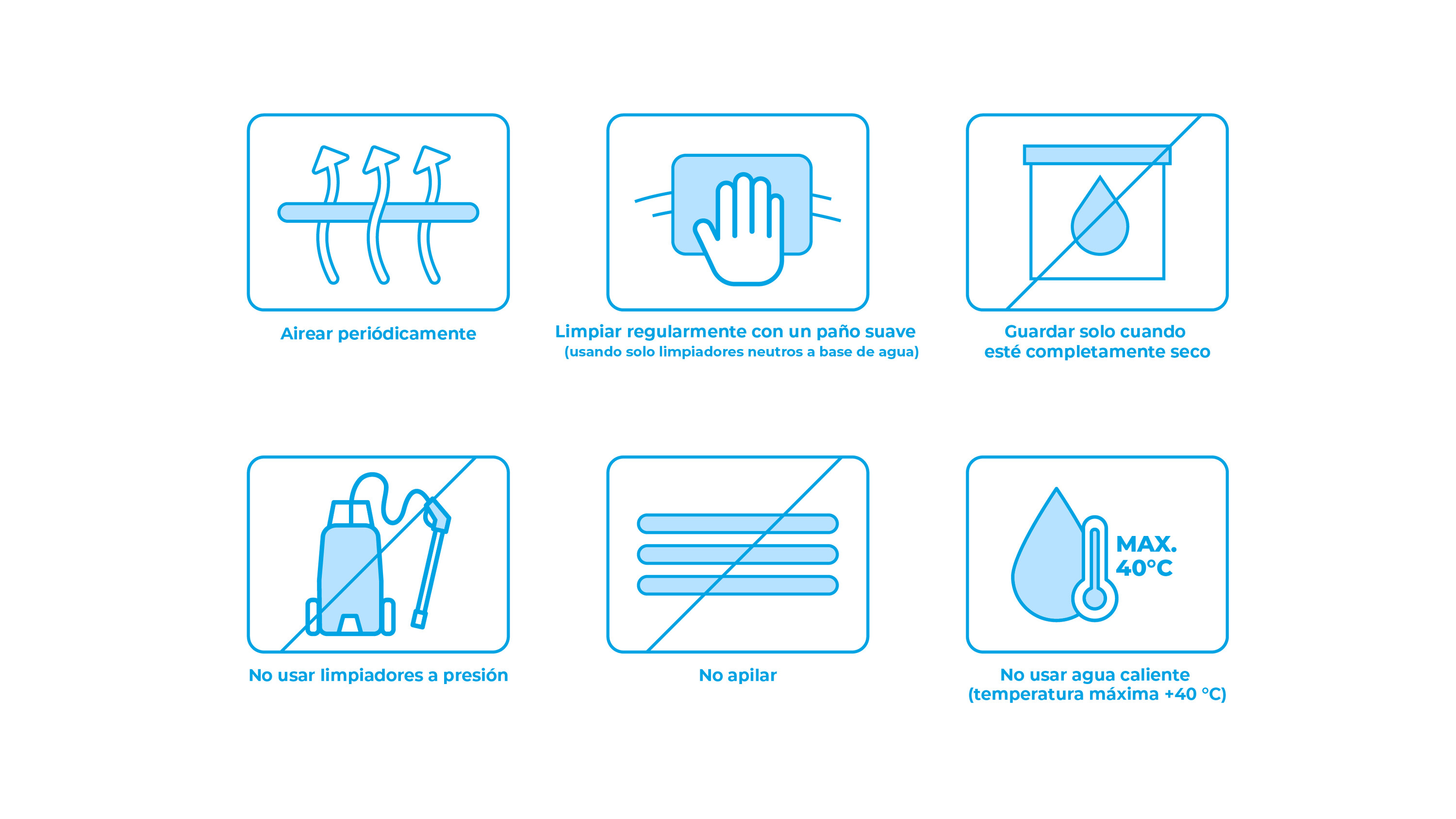 Al almacenar nuestros tejidos, es esencial mantener el material en un lugar seco. La temperatura recomendada de almacenamiento es entre +10 °C y +30 °C.